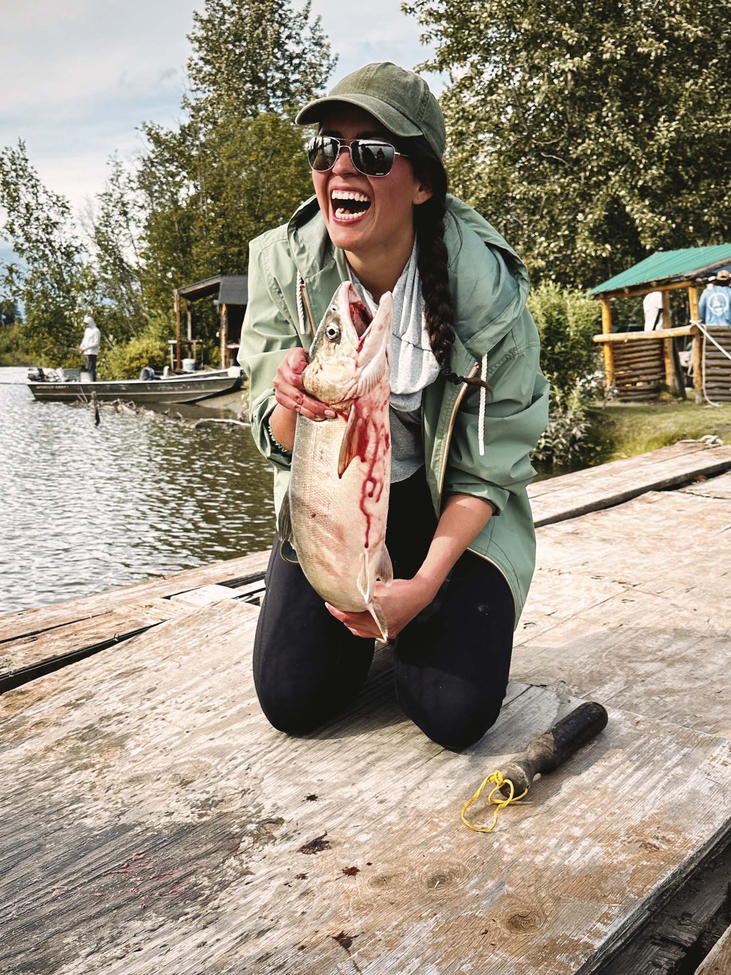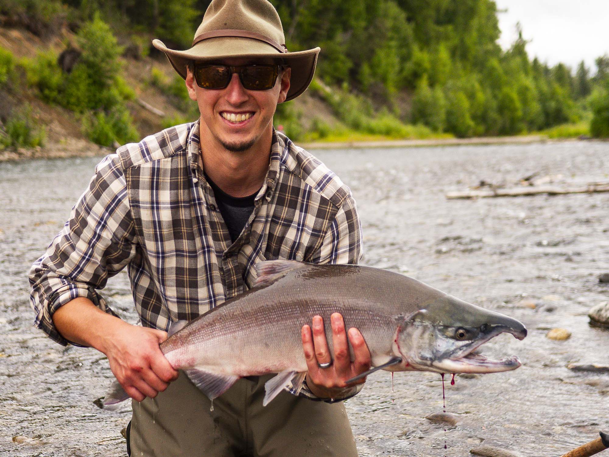 The main push usually arrives around the twentieth of July and carries through August. Fish move in pulses, sliding past the lodge and stacking along travel corridors and near spawning gravel.