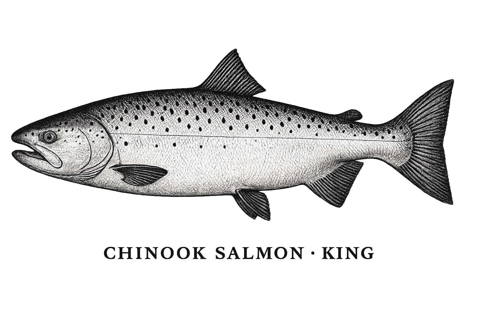 Sleek silver fish with small black spots mostly on the upper half of the tail. White gums and a more streamlined build than Kings.