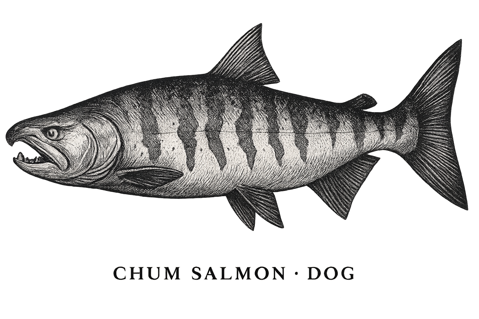 Thick shouldered salmon with a broad tail. As they color up they show bold vertical purple and green bars and pronounced teeth that give them their dog salmon nickname.